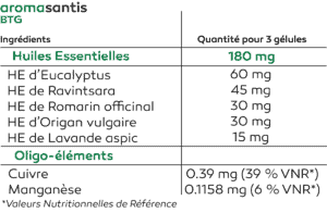 Ingrédients (pour 3 gélules) : Emulsifiant: Lécithine de soja, Gélatine (enveloppe de gélule), Emulsifiant: Monolaurate de sorbitane, Huile Essentielle d’Eucalyptus smithii, Huile Essentielle de Ravintsara, Emulsifiant: Polysorbate 80, Huile Essentielle de Romarin officinal, Huile Essentielle d’Origan vulgaire, Huile Essentielle de Lavande aspic, Sulfate de Cuivre, Sulfate de Manganèse.